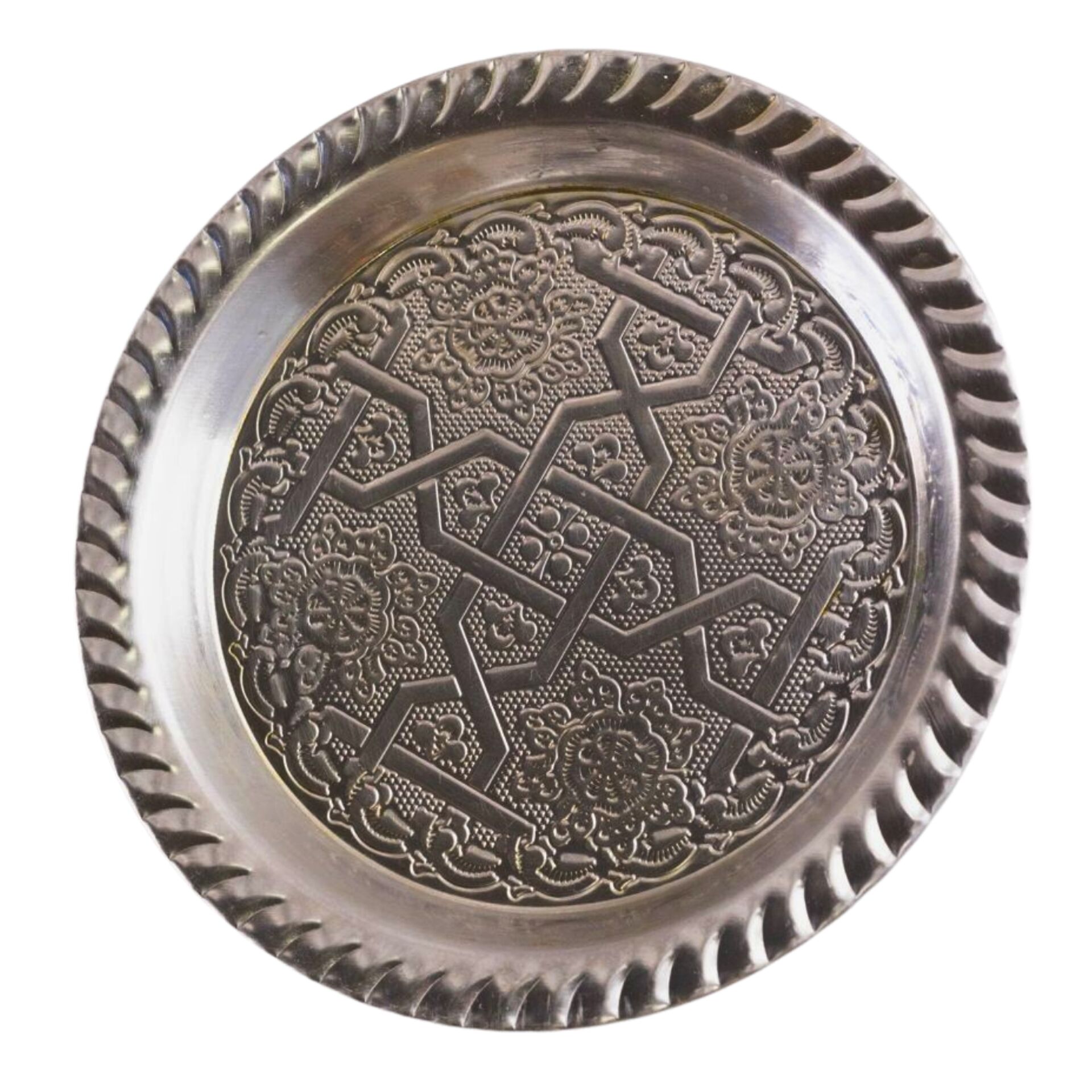 Petite assiette métallique Jasper de couleur argent. Parfaite pour la présentation d’entrées, accompagnements ou éléments décoratifs. Son aspect travaillé apporte une note raffinée et orientale aux tables de réception et buffets.